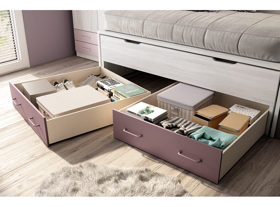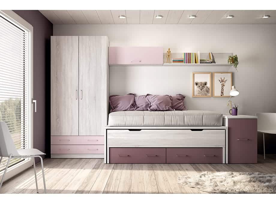 Este actual dormitorio juvenil es muy completo, del que podemos destacar la mesa de estudio plegable que es realmente práctica ya que la podremos tener escondida si no la utilizamos. Es un conjunto muy práctico y en unos colores que les van a encantar a los más pequeños de casa: Hibernian, Lila y Malva.