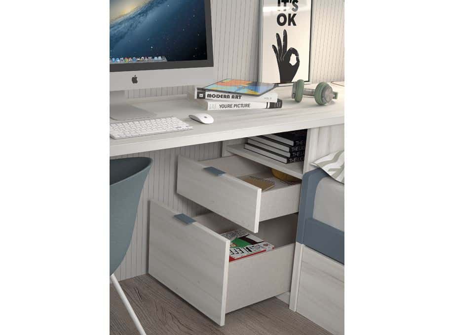 Composición en color base Quarzo y combinado con el color Avio, una combinación muy especial y actual. Estos muebles tiene unos detalles de calidad y una cama realmente práctica.