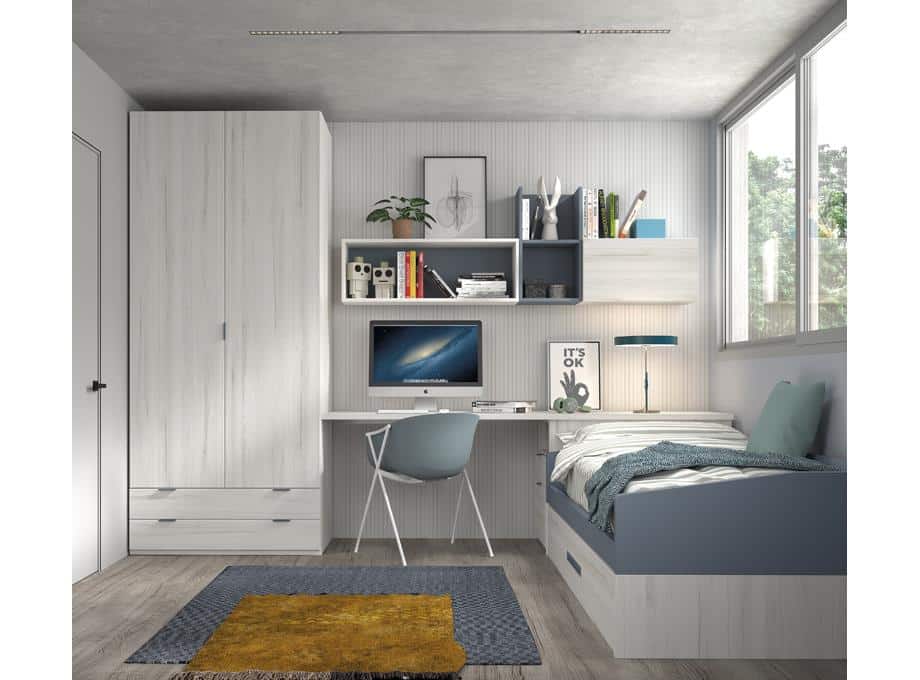 Dormitorio juvenil completo con una cama compacta baja, un armario y zona de estudio, todo en unos colores perfectos para poder decorar con con facilidad y con estilo.