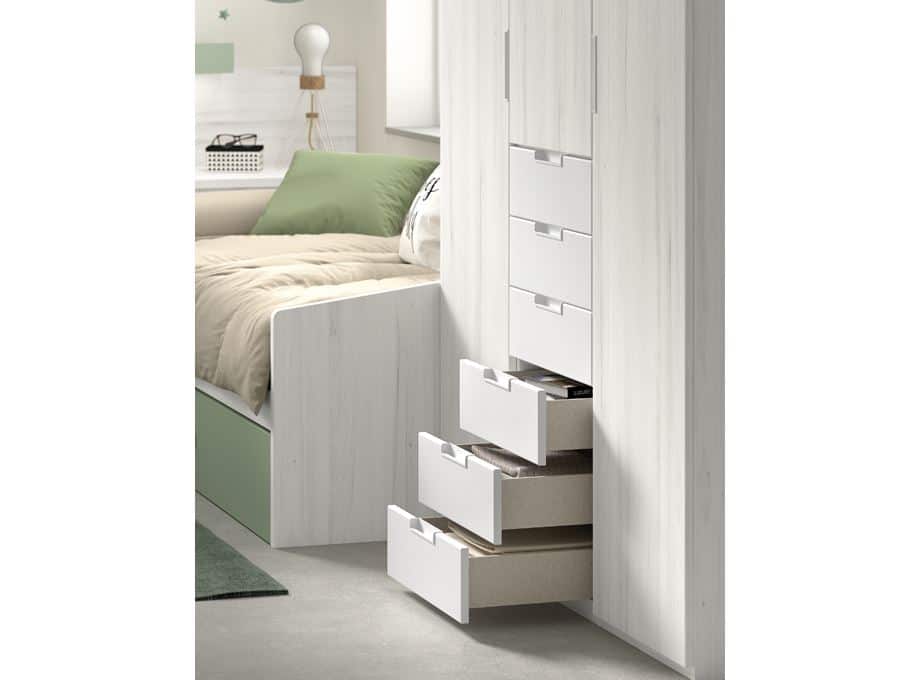 Armario 3 puertas + 6 cajones de 153,1 x 57,5 cm; nido modelo 846 con somier de arrastre 190 x 90 cm; encimera 30 recta con 1 terminación curva de 241 cm; pie de mesa Cubox 51 x 73,5 cm; estante You con led de 101,5 cm; respaldo de 210 cm; respaldo de 50 cm; arcón zapatero lateral 51 x 73,5 x 101 cm.