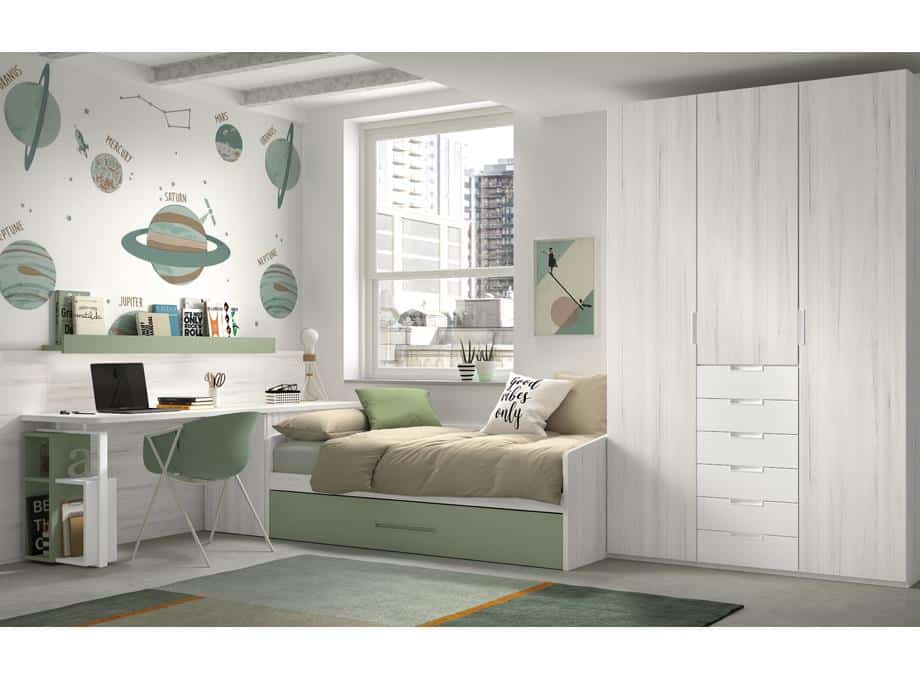 Conjunto nuevo juvenil con unos grandes detalles. Cuenta con un gran armario de tres puertas con cajones vistos, una cama compacta baja muy práctica, la zona de estudio y un estante de pared muy original que es ideal para colocar los libros y decorar a la vez. Estos muebles los tenemos en color base Quarzo y con detalles en color Blanco y Cipres.