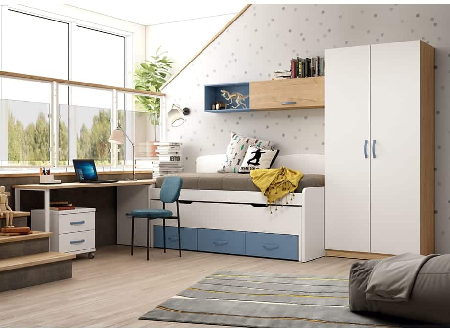 Sencillo dormitorio juvenil en el que tenemos una cama compacta, con un práctico armario a juego y una zona de estudio. En esta parte de estudio tenemos la mesa de estudio y unos cajones con ruedas muy prácticos. Este conjunto lo tenemos en color Bambú, Blanco y Azulón.