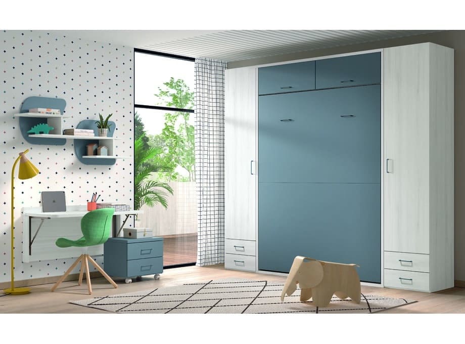 Elegante y juvenil mueble con cama abatible vertical con altillo para colchón de 190 x 135 cm. Cuenta con una zona de estudio muy práctica y unos originales estantes de pared. La medida de la composición es de 135 cm + 254 cm.