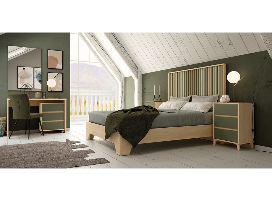 Completo dormitorio de matrimonio que consta de la zona de descanso con el cabezal, la bañera y las dos mesitas de noche de tres cajones. En la otra parte tenemos una mesa de 120 cm, que nos sirve tanto de escritorio como de tocador, con su espejo. Calidad y diseño todo en color Roble y Oliva.