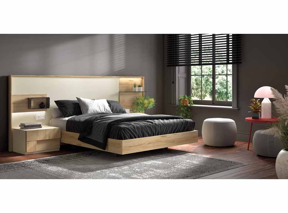 Cabezal modelo 110 de 294 x 122 cm para somier de 150 cm con mesitas de 60 cm; mesita modelo 137 izquierda de 60 cm con 2 cajones; mesita modelo 137 derecha de 60 cm con 2 cajones; aro modelo 131 de 162 x 200 cm para somier de 150 x 190 cm. Opciones para añadir, no incluidas: barras de luces LED, llaves de luz y cargadores USB.