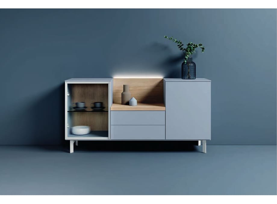 Aparador de diseño para que puedas completar su salón y que es muy funcional. Lo tenemos en color Mela y color Azul con detalles en aluminio blanco y el cristal es acanalado.