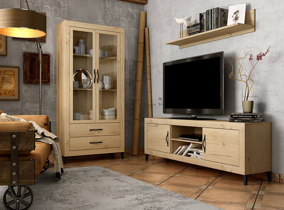 Conjunto de muebles para tu salón que cuentan con un mueble que es bajo y que tiene dos puertas y un práctico hueco, que será muy útil para poner el DVD u otros aparatos electrónicos. Al lado tenemos una vitrina con dos puertas de cristal, que nos sirven tanto para almacenar como para decorar, y tiene también dos cajones. Medidas: 180 + 90cm.