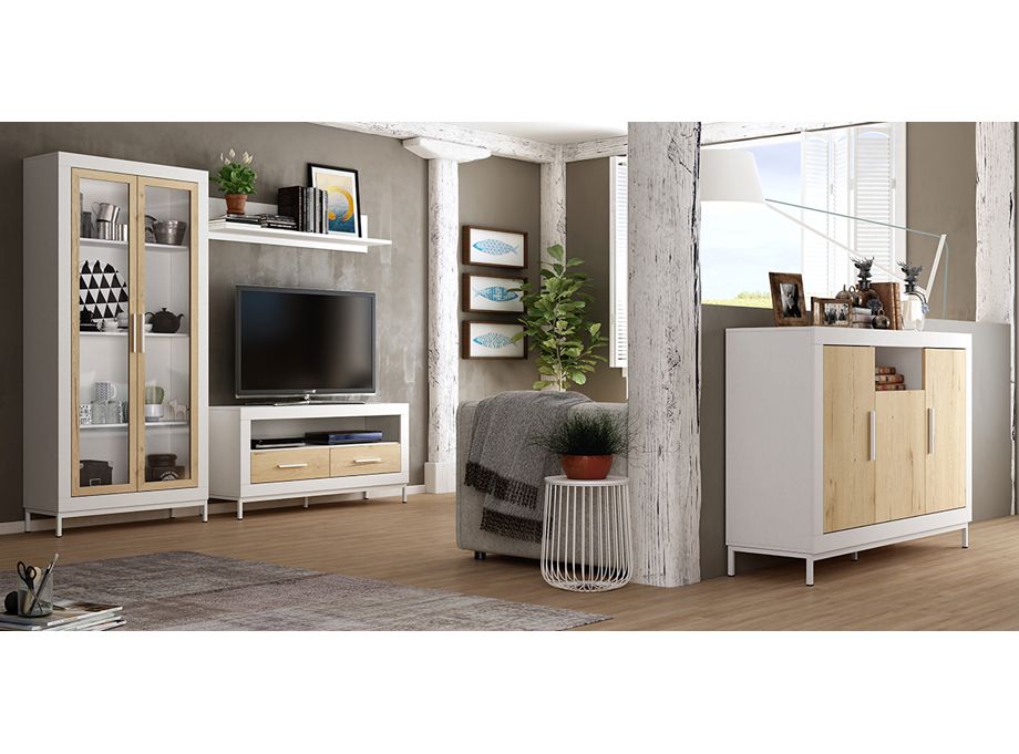 Conjunto de muebles para el salón que está formado por distintos módulos y muebles que nos permiten tener mucho espacio disponible de almacenaje, a la vez que espacio decorativo. Es un mueble elegante con diseño funcional y moderno. Medidas: 90 + 130 + 150cm.