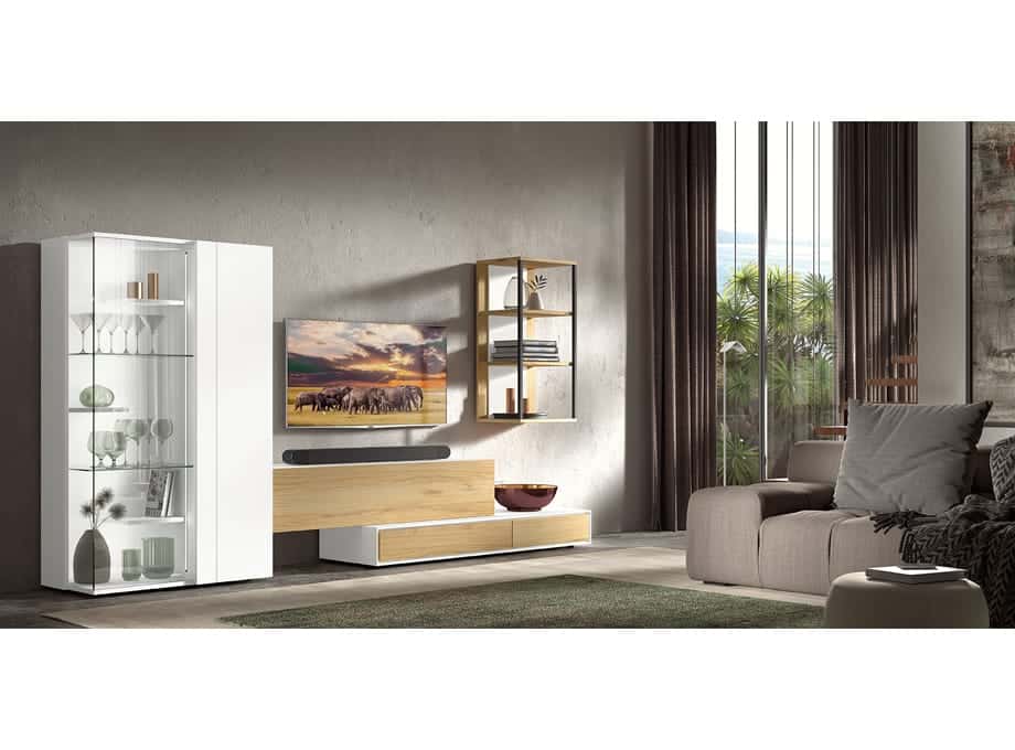 Composición para salón que está compuesta por un módulo bajo vertical, bajo con dos cajones, módulo alto y una original estantería con barras metálicas. Los colores elegidos para este conjunto son el Blanco Poro y el Roble Alabama.