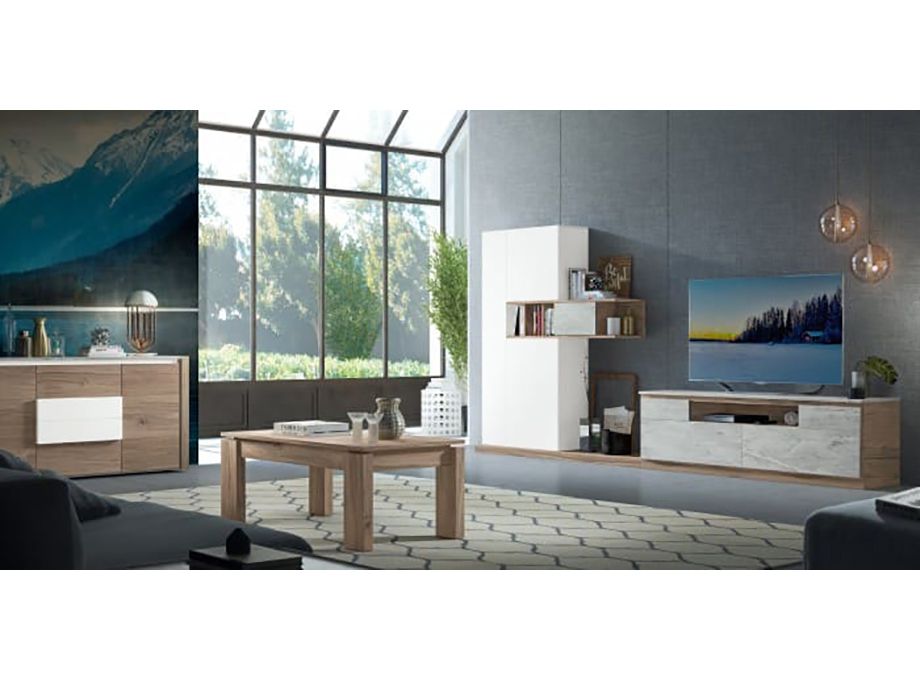 1 bajo TV 183x51x46cm caja smart tapa mármol blanco, 2 cajones guía push mármol blanco; 1 alto 1 puerta izquierda 30x180x35cm blanco poro; 1 alto 1 puerta derecha 60x60x35cm blanco poro; 1 alto 1 puerta derecha 60x90x35cm blanco poro; 1 módulo diáfano derecho 120x30x35cm smart, puerta abatible mármol blanco; 1 base 138x43x6cm smart; 1 zócalo 183x43x6cm. Medidas: 321x186cm.