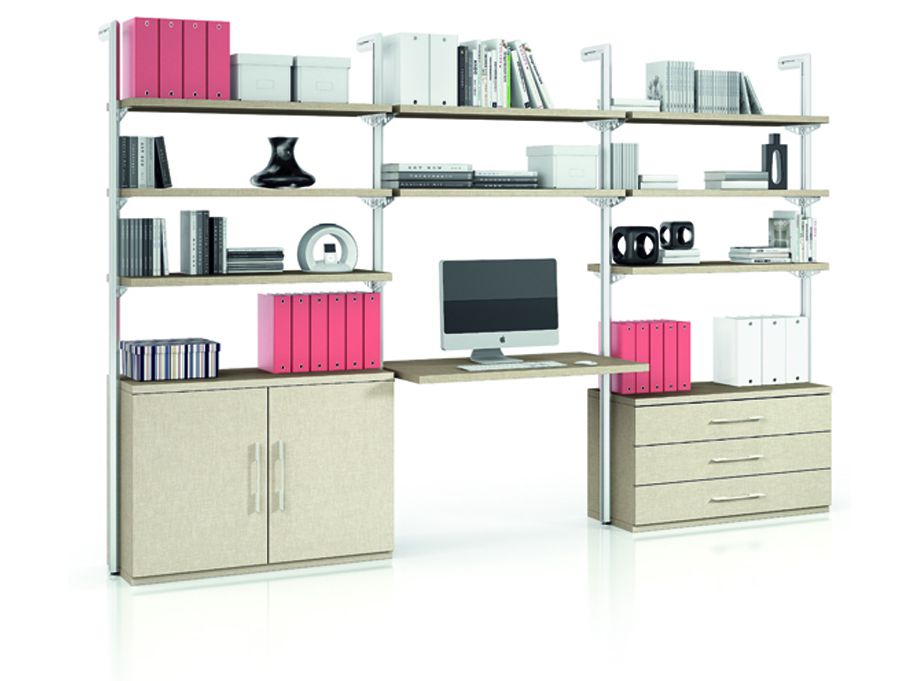 Librería de fondo 55cm. Consta de columnas de aluminio, estantes, sobre para mesa estudio, módulo con puertas y módulo con 3 cajones.